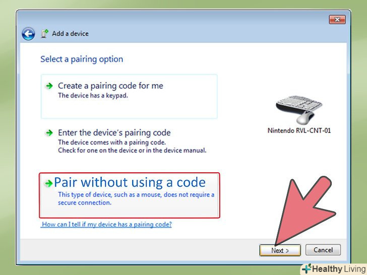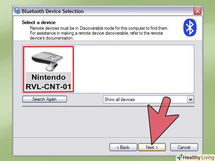 Виберіть "Nintendo RVL-CNT-01" у списку пристроїв, а потім натисніть < span class="nowrap" title= " This is not a clickable button; it illustrates the button one should find." style="font-family: Segoe UI, Frutiger, Frutiger Linotype, Dejavu Sans, Helvetica Neue, Arial, sans-serif;letter-spacing:0px;padding:0em .6em; border:1px solid; border-color:#AAA #555 #555 #AAA; -moz-border-radius: 0px; -webkit-border-radius: 0px; border-radius: 0px; background-color: #F2F2F2; background-image: -moz-linear-gradient(top, #FCFCFC, #E0E0E0); background-image:-o-linear-gradient(top, #FCFCFC, #E0E0E0); background-image:-webkit-linear-gradient(top, #FCFCFC, #E0E0E0); background-image: linear-gradient(top, #FCFCFC, #E0E0E0);">далі.