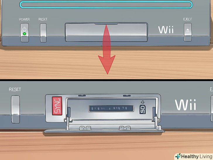 Відкрийте кришку SD-карти на передній панелі Wii.якщо у вас Wii Mini, кнопка синхронізації знаходиться на лівій стороні консолі поруч з батарейним відсіком.