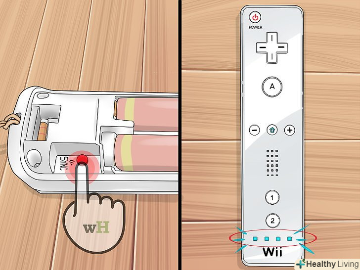 Натисніть кнопку синхронізації на задній панелі пульта Wii.ця кнопка розташована нижче батарейного відсіку. Світлодіодні індикатори на пульті Wii почнуть блимати, а потім загоряться-це вказує на стабільне з'єднання.