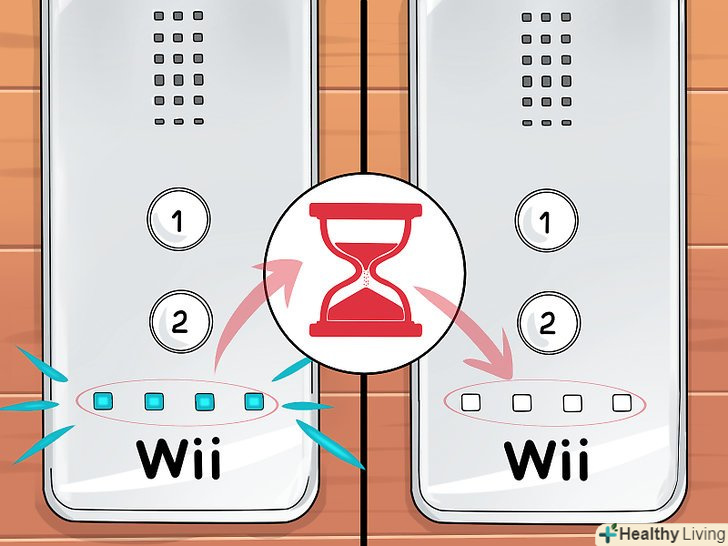 Натисніть і відпустіть кнопку синхронізації на задній панелі пульта Wii.ця кнопка розташована нижче батарейного відсіку. Світлодіодні індикатори на пульті Wii почнуть блимати.