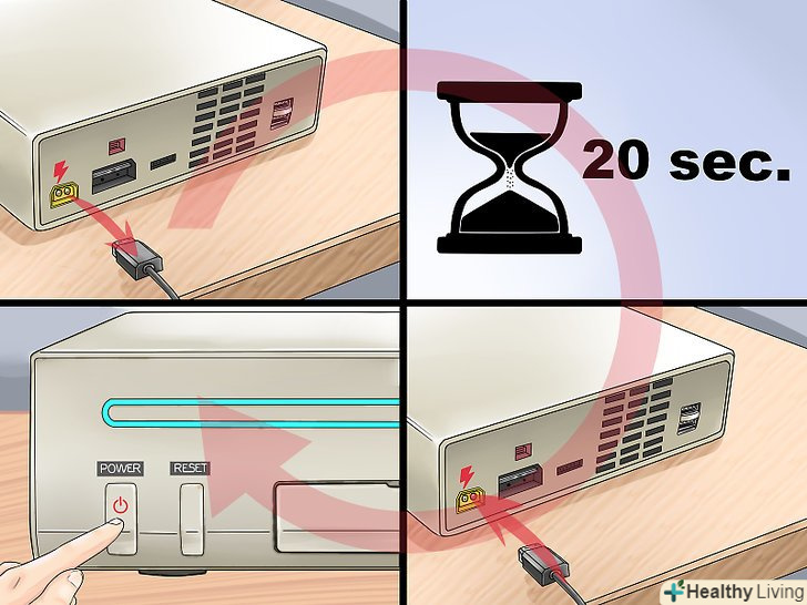 Від'єднайте кабель живлення від задньої панелі Wii і почекайте близько 20 секунд.потім знову підключіть кабель і включіть консоль. Так ви перезавантажите Wii, що, можливо, призведе до вирішення проблеми.[2]