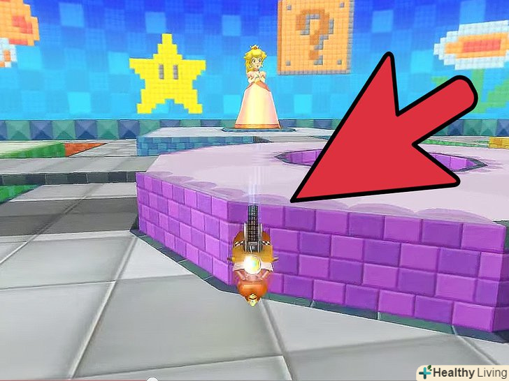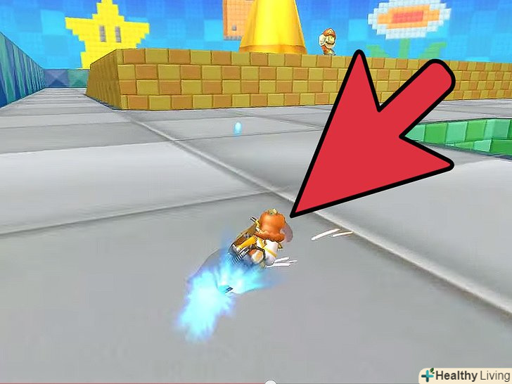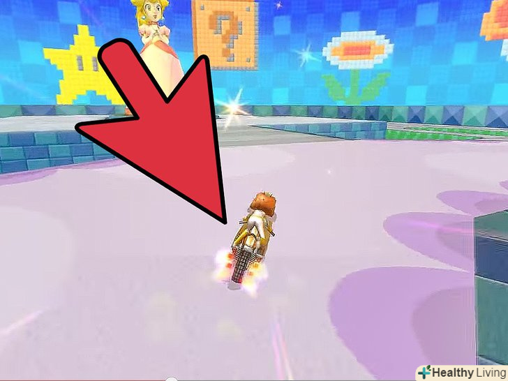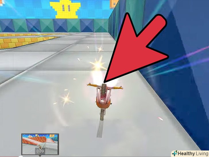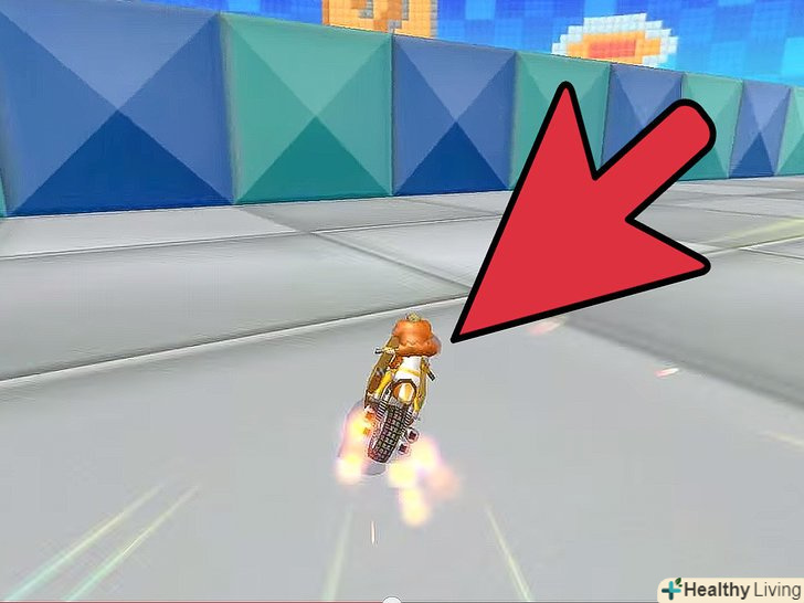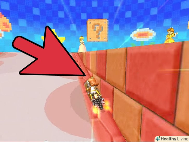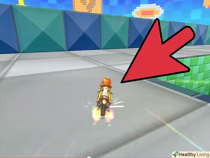 Шукайте можливість, щоб піднятися в повітря. В Mario Kart Wii ви не можете робити трюки де завгодно. Для повітряних трюків, щоб відірватися від землі, потрібно, перш за все, заїхати на якусь похилу поверхню, наприклад, на пандус. Як правило, на кожній трасі є багато можливостей, щоб заробити трохи часу в повітрі.- Прискорювальні пандуси, які світяться кольорами веселки-це найбільш помітні місця для виконання трюків. На будь-якому з них у вас з'явиться можливість зробити трюк. На деяких трасах, таких як "кокосова алея", у вас просто не вийде проїхати повз одного з них.[1]