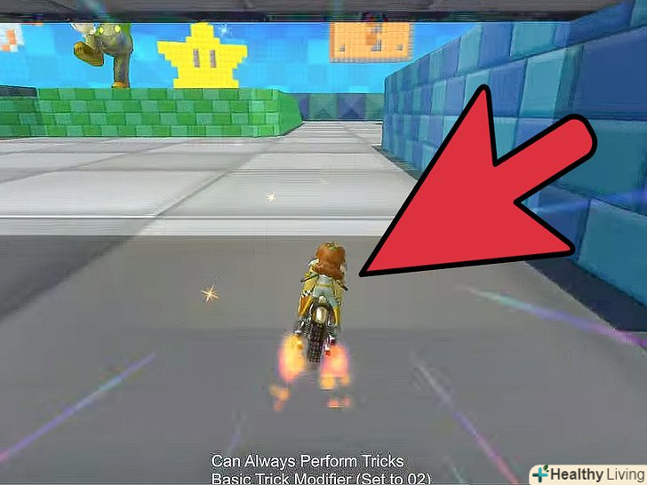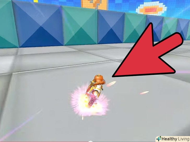 Струсіть WiiMote, як тільки відірветеся від землі, щоб зробити трюк.З'їжджаючи з пандуса або підстрибнувши, потрясіть WiiMote або різко пересуньте його в будь-якому напрямку. Зробіть це з невеликим зусиллям, щоб контролер зареєстрував дію, але не надто сильно, інакше можете втратити контроль над управлінням після приземлення. Якщо ви правильно розрахуєте час, то робіть трюк! Ви відчуєте вібрації контролера, прозвучить звуковий сигнал, і ваш гонщик пожвавиться.- Коли ви струшуєте WiiMote в різних напрямках (вгору, вниз, вліво або вправо), у вас повинні вийдуть різні трюки. Проте, приріст швидкості в будь-якому випадку буде однаковий.