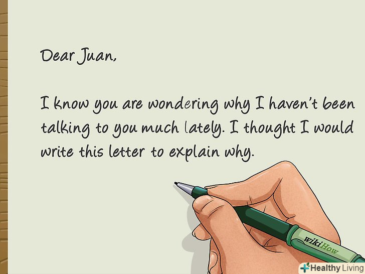 Напишіть листа. Подумайте про написання листа, якщо ви хочете, щоб друг знав про ваші почуття, але не хочете обговорювати це з ним особисто. Лист дозволить вам приділити час пошуку необхідних слів, а також допоможе розібратися у власних почуттях. [8]- Ви могли б написати: "дорогий Діма, тобі, можливо, цікаво, чому я останнім часом так мало з тобою розмовляю. У цьому листі я б хотів пояснити тобі, чому"» Потім можете описати одному свої почуття і те, як бачите розвиток ситуації в майбутньому.