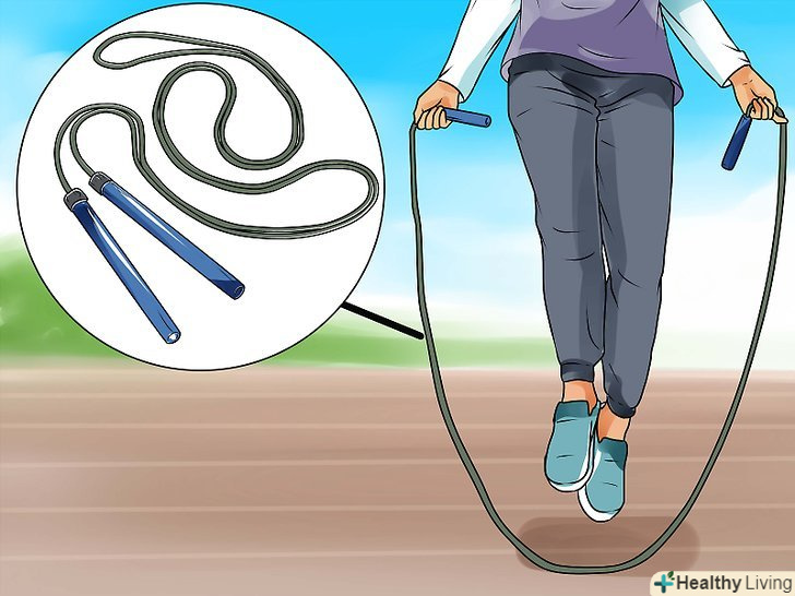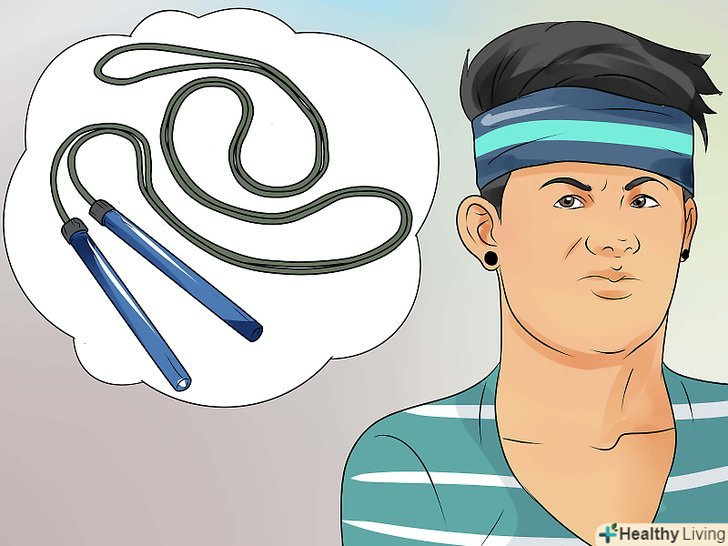 Візьміть скакалку. Скакалка-це відмінний вид навантаження для розминки. Купіть нову скакалку або використовуйте стару, яка могла завалятися у вас на антресолях. Якщо плануєте ходити в зал, попросіть співробітників підшукати вам скакалку. [1]