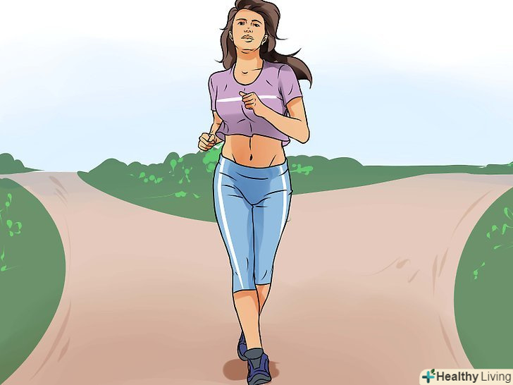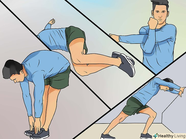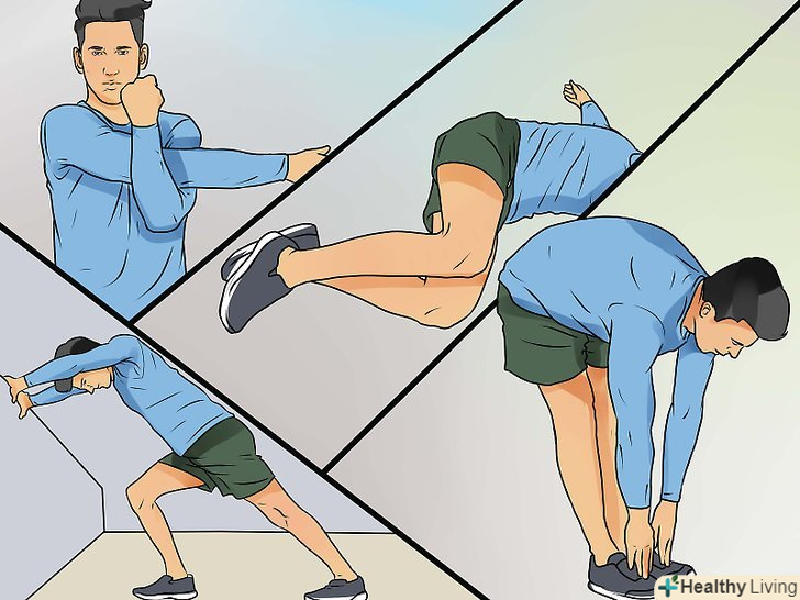Зробіть вправи на розтяжку. Завершіть тренування розтяжкою. Спочатку потягніть м'язи нижньої половини тіла (ікри, підколінні сухожилля, Нижні м'язи спини). Потім переходите до верхньої половини тіла — до м'язів кора, верхніх м'язів спини і до шиї. Якщо якісь м'язи болять, приділіть їм більше часу. [5]- Щоб потягнути ікри, станьте на відстані півметра від стіни. Поверніться до стіни обличчям, упріться в неї руками для рівноваги. Зігніть праву ступню так, щоб основна частина притиснулася до стіни, а п'ята залишилася на підлозі. Притисніть до стіни, щоб посилити натяг. Повторіть з іншою ногою. [6]