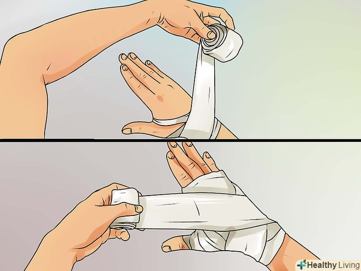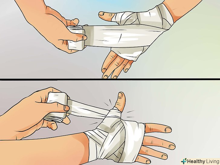 Зафіксуйте великий палець. оберніть його один раз, простягніть бинт по тильній стороні долоні і обмотайте зап'ясті. Потім почніть обмотувати палець, але не цілком — простягніть бинт по долоні уздовж основи пальців. Тканина зміститься.- Це дозволить зафіксувати великий палець і бинт.