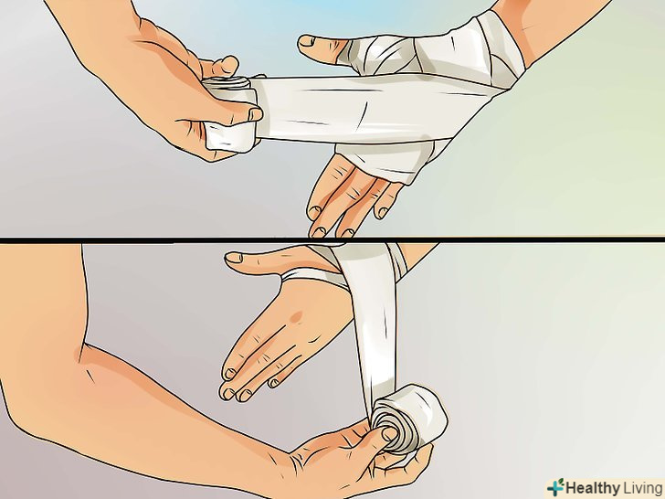 Оберніть пальці. розташуйте бинт діагонально уздовж долоні — від основи мізинця до основи великого пальця. Простягніть бинт між вказівним пальцем і великим, розташуйте його діагонально по тильній стороні долоні. Бинт повинен розташовуватися хрест-навхрест на тильній стороні. Перемістіть бинт до основи великого пальця. Знову обмотайте їм кисть хрест-навхрест, простягнувши бинт між середнім і безіменним пальцями, а потім — ще раз між середнім і вказівним пальцями. В кінці закріпіть бинт біля основи великого пальця.- Це дозволить відокремити пальці один від одного.