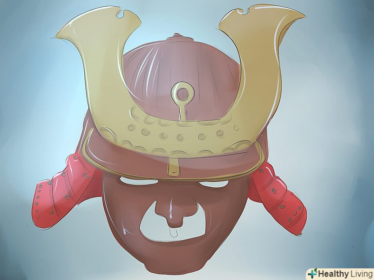 Носите маску Менгу . Уявіть собі жах ворога, коли він зустрічається віч-на-віч з самураєм і бачить холодні очі залізної маски, застиглої в страшній гримасі! Зазвичай Менгу носили не тільки щоб захистити обличчя і шию в битві, але і щоб налякати противника. Тому така маска могла мати страхітливий вигляд, наприклад, зображати оскаленого демона. [9]- Справжні Менгу зазвичай робили з металу або шкіри, але ви можете зробити маску з гіпсу. Просто зробіть зліпок шиї, підборіддя і нижньої половини обличчя, а коли маска висохне, пофарбуйте її в колір своїх обладунків. Можете докладніше почитати про те, як робиться гіпсова маска.