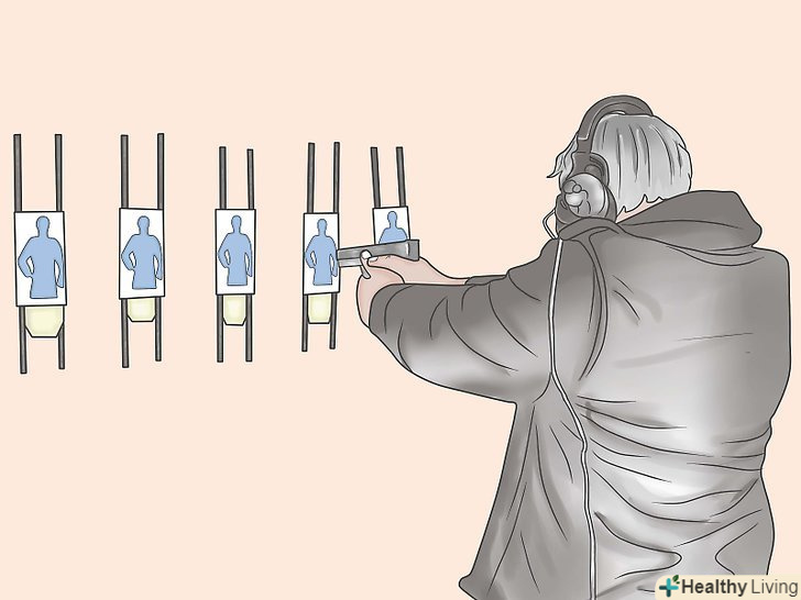 Потренуйтеся в русі. і в русі ви також повинні вміти вражати ціль з відстані в 6.5 метрів. Розташуйте три або більше мішеней на відстані в кілька метрів один від одного. Відійдіть на 14-17 метрів і починайте рух. Біжіть, поки між вами і вашою першою метою не залишиться близько 9 метрів, одночасно виймайте пістолет і займайте стартову позицію. Зробіть два постріли, потім прямуйте до наступної мети і т. д.- Робіть це знову і знову і кожен раз біжіть швидше; постарайтеся не зупинятися, коли стріляєте (ви повинні навчитися прицілюватися на бігу), чим довше пауза, тим точніше ви прицілитеся, але в умовах реального бою все відбувається в рази швидше, ніж на тренуванні.