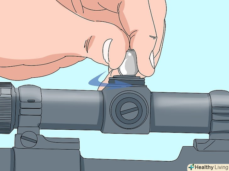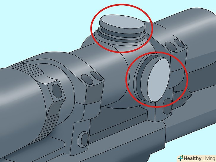Перевірте регулюючі ручки. більшість прицілів мають дві ручки, одну нагорі і одну збоку, які використовуються для налаштування прицілу і дають можливість обнулити його так, щоб те, що ви бачите, і куди прицілена гвинтівка збігалося. Верхня ручка використовується для регулювання перехрестя вгору-вниз, а та, що зверху – налаштовує приціл по горизонталі.- Для деяких старих моделей прицілів, щоб акуратно крутити ручку вам знадобиться монета або маленький ключ, хоча на більшості інших прицілів ви можете обійтися тільки пальцем для того, щоб обертати ручку також, як ви крутите диск або циферблат.