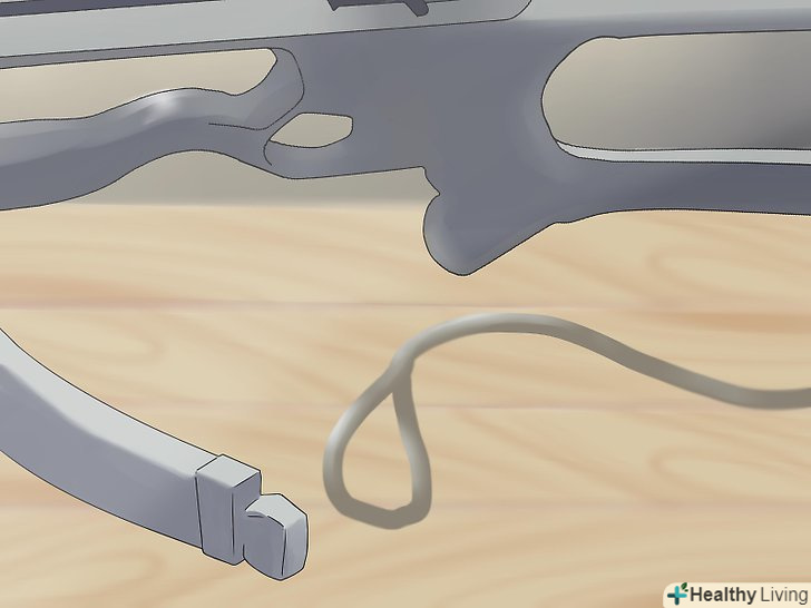 Зворотний процес, щоб видалити тятиву. Якщо вам треба видалити тятиву, прикріпіть пристрій до обох виїмок і підніміть арбалет разом з пристроєм замість реальної тятиви. Відчепіть обидва кінці реальної тятиви, потім вистрілите з арбалета і видаліть пристрій обома руками.- Також можна відчепити один кінець тятиви, коли арбалет піднятий. Якщо ви це зробили, інший кінець може бути видалений, коли ви знімаєте пристрій.