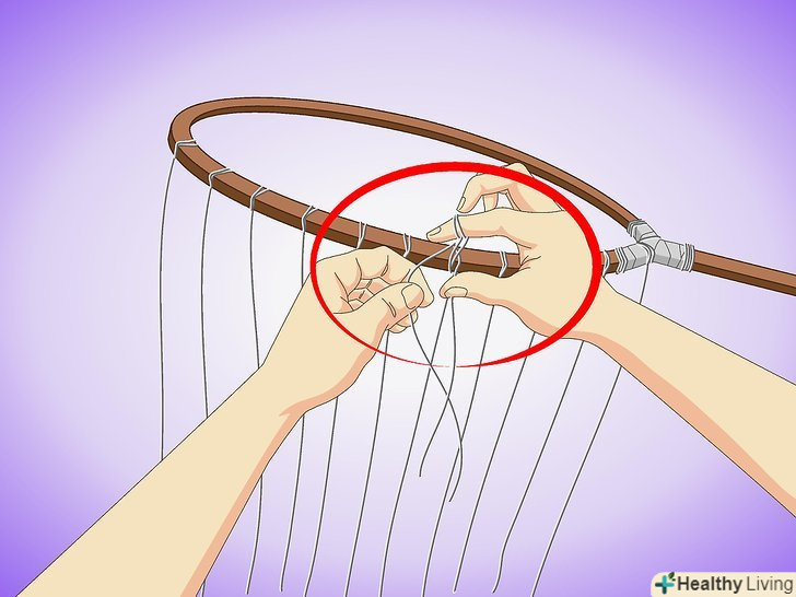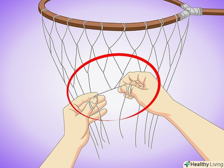 Тепер настав час почати зав'язувати вузли. для накидної мережі вам потрібно зав'язати прямий вузол на кожному перетині ниток. Якщо ви робите сачок, то процес трохи складніше, але цілком здійсненний. Ви починаєте з того, що берете кожну прив'язану нитку і прив'язуєте її вільний кінець прямо на протилежний край обода. Звисаючі нитки тепер повинні нагадувати сітку. Тепер вам потрібно прямим вузлом прив'язати першу коротку нитку на 2,5 сантиметра нижче обода до першої висить нитки, а потім переходити по колу від однієї висить нитки до іншої, зав'язуючи на кожному перетині вузол, до тих пір, поки ви не повернетеся до початку. Опустіться нижче на 2,5 сантиметра і повторіть все процедуру знову, а потім продовжуйте процес до тих пір, поки не досягнете дна мережі.