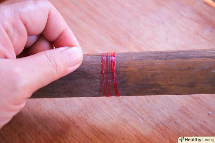 Прикріпіть стрічку і рибальську волосінь. Візьміть шматок стрічки близько 6 метрів в довжину і обмотайте нею плоску частину палиці за 12 см від краю.- Перевірте, щоб вузол був міцним і надійним. Іншу стрічку обмотайте навколо кінця палиці.