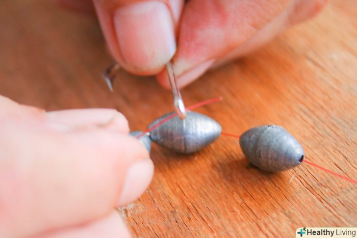 Прикріпіть гачок, поплавок і грузик. разом з поплавком і грузиком прив'яжіть до кінця волосіні гачок або блешню.- Тепер ваша саморобна вудка з бамбука готова! Щоб зробити волосінь коротше, потягніть волосінь через петлі на себе і обмотайте її навколо рукоятки. [2]