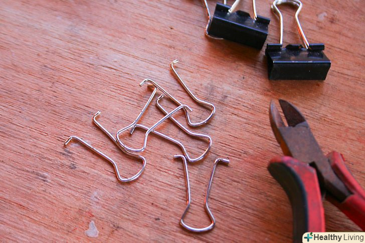 Прикріпіть вушка. Візьміть набір затискачів середніх розмірів (за кількістю дірок, які ви просвердлили) і протягніть дріт через затиск.- Плоскогубцями обмотайте один кінець дроту про інший. Коли ви це зробите, у вас повинно вийти закрите кільце з одного боку дроту, а другий кінець повинен бути спрямований всередину. Те ж саме зробіть з іншого дротом.