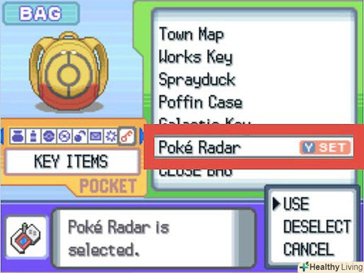 Зайдіть в траву. Радар працює тільки в невисокій траві, так що спершу знайдіть таку. Використовуйте Repel, за допомогою якого ви зустрінете тільки того покемона, якого можна знайти в трясучій траві (за умови, що рівень ваших покемонів вище рівня диких покемонів в цій локації). Ви також не повинні перебувати на велосипеді. Коли ви опинитеся в потрібному місці, застосуйте радар.