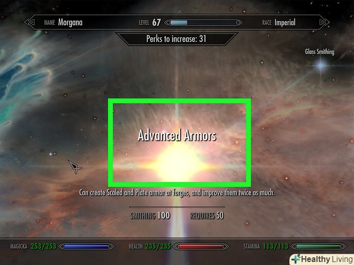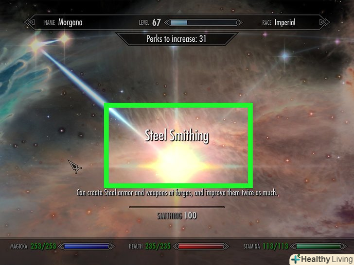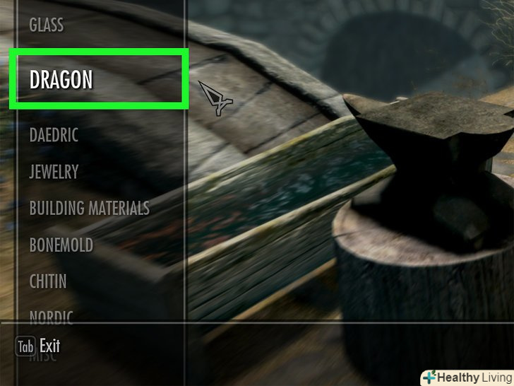 Вивчіть навик «сталеві обладунки». виберіть цей навик і натисніть на кнопку дії. Щоб дістатися до драконівських обладунків, вам знадобиться 5-6 очок умінь, перше з яких піде якраз-таки на сталеві обладунки.- Якщо ви підете по лівій частині дерева навичок (там ви навчитеся робити легку броню і відповідну зброю), то вам знадобиться всього 5 очок навичок.