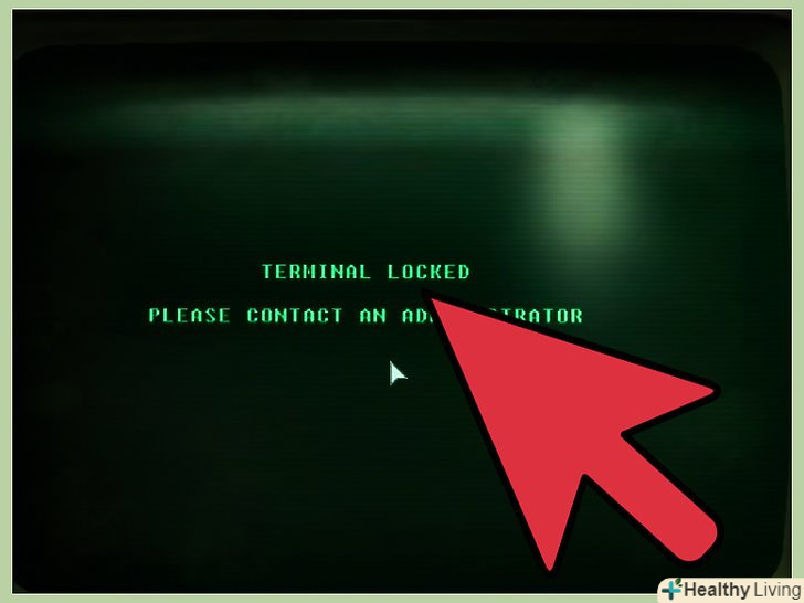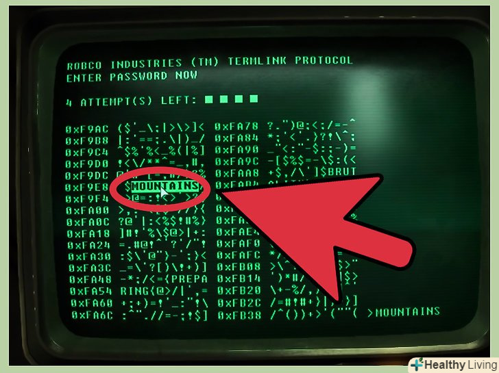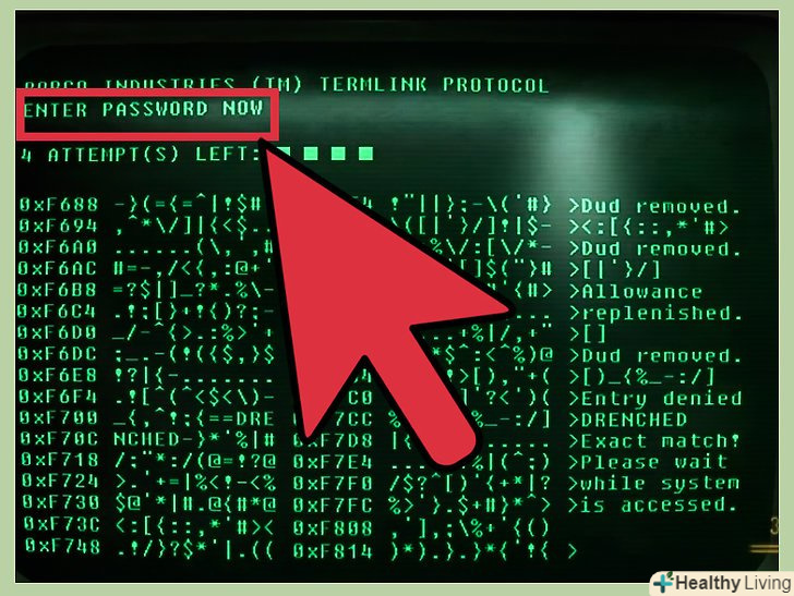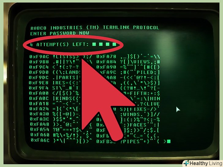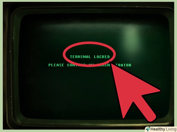 Не приступайте з ходу до четвертої спроби. якщо і в четвертий раз ви виберете неправильно, термінал буде заблокований. А єдиний спосіб активувати заблокований термінал-знайти предмет, що містить пароль, але не для всіх комп'ютерів можна вирішити проблему таким чином. Ось кілька інших варіантів, які можна спробувати після досягнення четвертої спроби:- Використовуйте залишилися хитрощі зі дужками. Якщо ви залишили дужки на крайній випадок, зараз саме час спробувати повернути собі спроби або прибрати достатньо варіантів, щоб визначити правильне слово.
