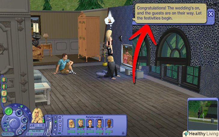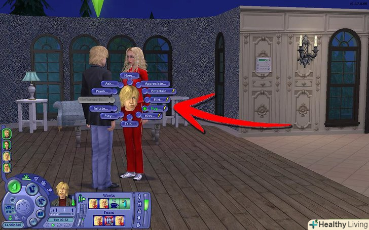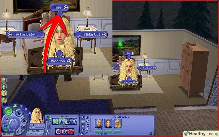 Доведіть любовні настрої до високого рівня. Починайте цілуватися і показувати потяг. Співайте серенади, мило базікайте, романтично цілуйтеся і захоплюйтеся партнером. Це повинно зіграти свою роль.- Якщо другому Сіму подобаються подібні дії, заплануйте цілу серію дії. Щось на кшталт:"базікати, базікати, Мило розмовляти, жартувати, базікати, поцілунок, базікати, захоплюватися, заспівати серенаду".