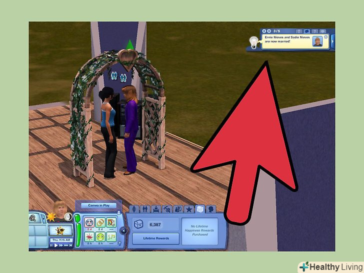 Зіграйте весілля. щоб одружитися негайно, виберіть вкладку «Романтично» → "влаштувати скромне весілля". Для великого ж святкування використовуйте зарученим сімом телефон, щоб» закотити вечірку «і виберіть»весілля".[8] після весілля ви зможете переселити іншого Сіма до себе додому.- Доповнення "всі віки" додає в гру безліч опцій і предметів, пов'язаних з шлюбом, включаючи Весільні арки, весільний торт, а також парубочий і дівич-вечір.