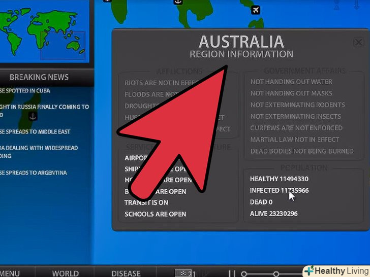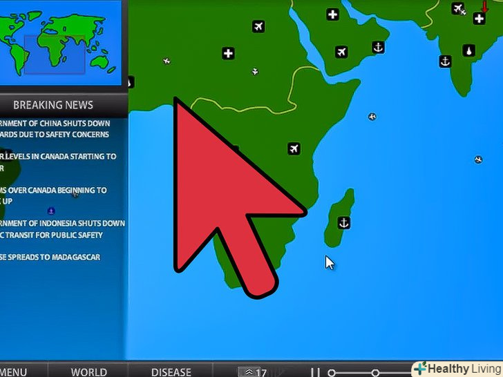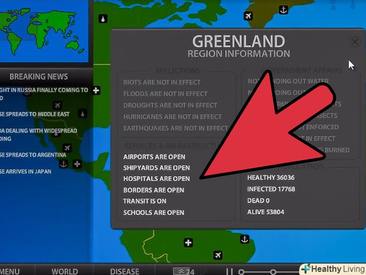 Спостерігайте, як поширюється ваше захворювання.до даного етапу ви повинні побачити, як різні регіони стають зараженими.- Звертайте увагу, коли закриваються порти. Якщо складні території на кшталт Мадагаскару, Гренландії, Аргентини або Індонезії закриють будь-який доступ до тих пір, поки ваша інфекція не заразить їх, все скінчено. Починайте знову.