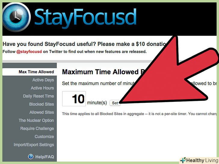 Натисніть на "Налаштування" і виберіть максимальний час до блокування сайту. введіть кількість хвилин у полі введення та натисніть «Встановити».