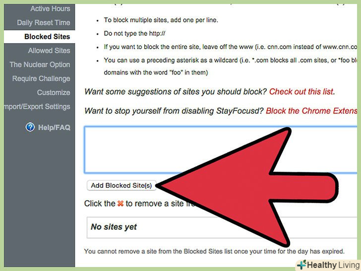 Додайте список сайтів в Налаштування. кожен раз, коли ви відвідуєте будь-який сайт з цього списку, кількість часу, проведений на сайті, буде відніматися з таймера. Таким чином, якщо таймер налаштований на 15 хвилин, і ви додали в список сайтів Facebook і Twitter, то у вас буде всього-на-всього 15 хвилин в день на відвідування цих сайтів.