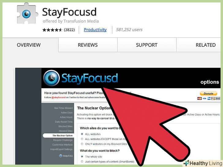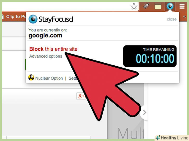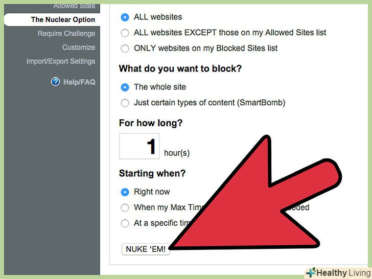 Перейдіть до крайніх заходів. якщо нічого з перерахованого вище не допомогло, скористайтеся такою опцією програми StayFocusd як "The Nuclear Option". В налаштуваннях натисніть на"The Nuclear Option". За допомогою цієї опції ви можете заблокувати або всю мережу, або все за винятком сайтів зі списку "дозволені". Введіть значення часу, який пройде до повного відключення мережі, налаштуйте інші опції і натисніть на "Nuke' Em!". Використовуйте цю опцію з обережністю-ви можете не виконати поставлені завдання, так як ви можете блокувати будь-якої потрібний сайт, наприклад, електронну пошту, яка необхідна вам для виконання поточного завдання.