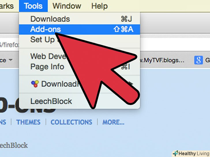 Натисніть на вкладку "Firefox", розташовану в лівому верхньому кутку браузера. (майте на увазі, що це стосується Firefox 6. У попередніх версіях Firefox натисніть на "Інструменти «--gt;»Доповнення".