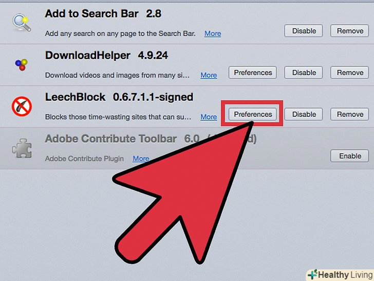 У Менеджері доповнень, який відкриється в новій вкладці, натисніть на» опції " навпроти LeechBlock.