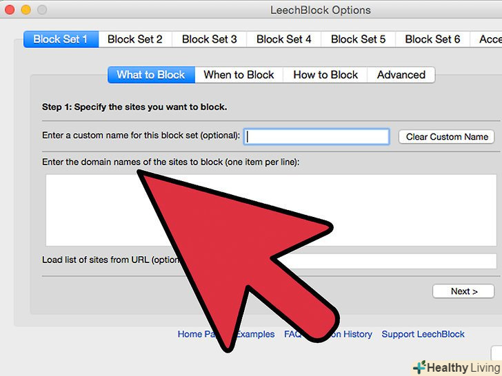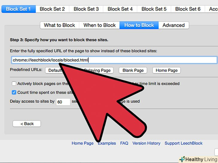 Виберіть, які URL LeechBlock буде пропускати при активному блоці.- Натисніть на вкладку " заборонити доступ до опцій цього блоку» - щоб припинити можливість змінити час роботи блоку перед його активацією.