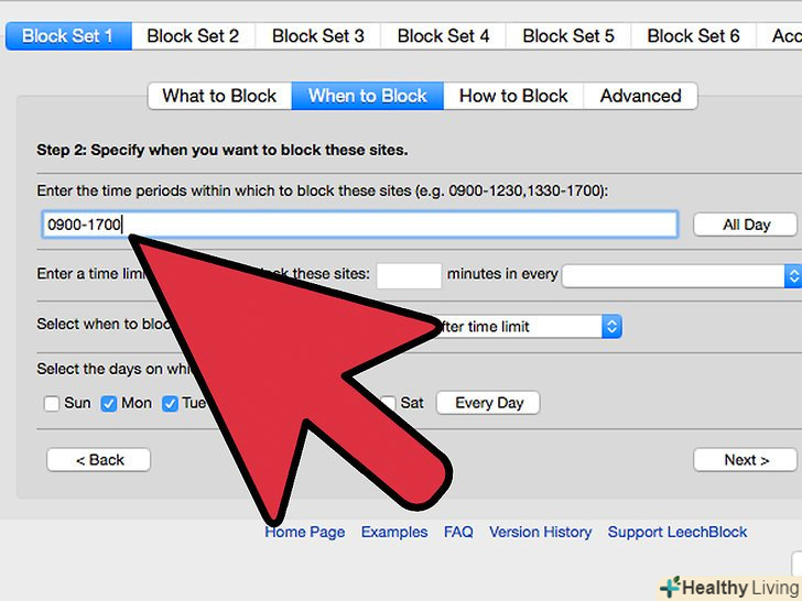 Встановіть період, коли блок буде активний.- Введіть періоди часу. Зробіть це в 24-годинному форматі, але не ставте двокрапку в середині. Наприклад, введіть: 0900-1700, замість 9-5.