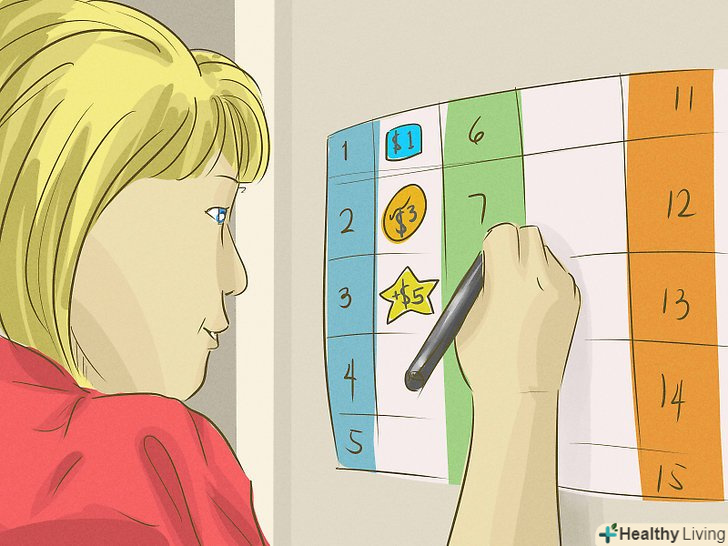 Складіть таблицю. визначившись з метою і сумою грошей, розрахуйте, скільки тижнів вам потрібно буде збирати, а потім створіть таблицю і повісьте її на стіну. Розпишіть щотижня по числах і розлінуйте таблицю по горизонталі і вертикалі. Кожного разу, коли ви кладете гроші в скарбничку або де-небудь ще, наклейте наклейку поруч з цим тижнем, щоб побачити, як далеко ви насправді просунулися. [1]- Виділити кілька основних етапів — це відмінний спосіб зберегти мотивацію в процесі накопичення грошей. Наприклад, викреслюйте основні етапи на великому плакаті, що зберігається у вас в кімнаті, коли заощадите 300 рублів, потім 600 рублів, 900 рублів і так далі. [2]
