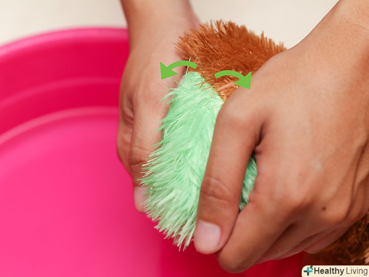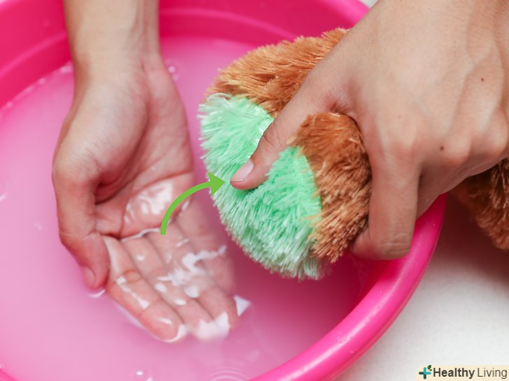 Намочіть ведмедя мильною водою. спочатку зніміть з іграшки весь одяг (якщо вона є) — в даний момент вам потрібно ретельно відмити самого ведмедя. Одяг можна буде випрати окремо. Змішайте краплю мила з теплою водою в раковині або в тазу для прання. Занурте іграшку в воду. [6]- Щоб не надто сильно мочити ведмедя, занурюйте у воду в першу чергу ті частини (голову, лапи, спину, живіт і так далі), які особливо потребують прання.