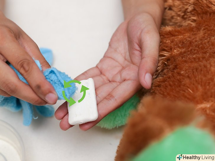 Скористайтеся миючим засобом. капніть трохи засобу для миття посуду на чисту ділянку серветки. Використовуйте лише маленьку краплю мила за один раз. Уникайте створення надлишків піни - її буде складніше повністю змити, через що шерсть іграшки може стати жорсткою після висихання. [2]- Якщо вам необхідно відчистити кілька плям або навіть кілька ведмедиків, або ж Ви знаєте, що вам часто потрібно чистити іграшки, візьміть одну чайну ложку засобу для миття посуду на кожну склянку води і змішайте все в пульверизаторі. [3] як варіант, можна скористатися рідким засобом для прання з розрахунку одна крапля кошти на склянку води. Розпилюйте підготовлений розчин безпосередньо на забруднення.