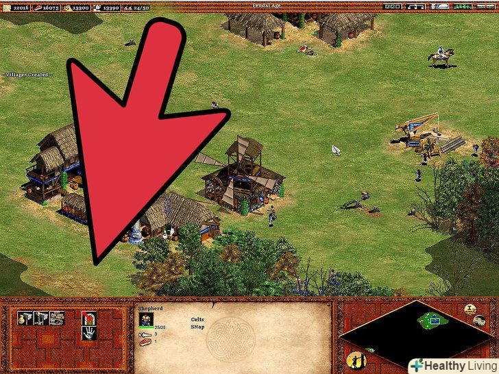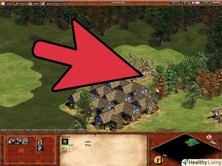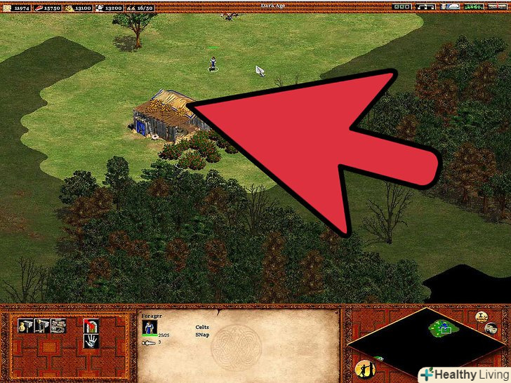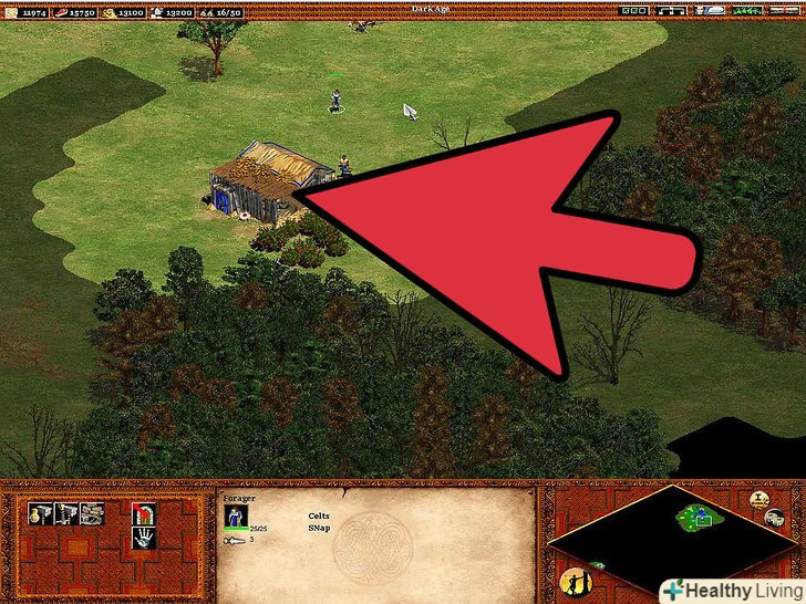 Продовжуйте створювати поселенців, поки не досягнете населення в 30 осіб.продовжуйте будувати будинки, поки тих не вистачить на 35 осіб. Деякі нові поселенці повинні бути послані в ліс, що дуже важливо, починаючи з феодальної епохи і далі. У лісі повинні працювати 10-12 поселенців.- Побудуйте шахту поруч з джерелом золота, розташованим поруч з ратушею. Так, у феодальну епоху золото ще не дуже потрібно, але тим не менш треба побудувати шахту в темні століття (або хоча б під час вивчення феодалізму). Чому? Та тому, що феодальна епоха пролетить в одну мить! Цивілізаціям, що стартують з -100 одиниць золота, і зовсім рекомендується заздалегідь потурбуватися цим питанням. Проте, на золоті має бути не більше 3 поселенців.