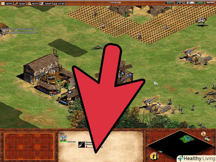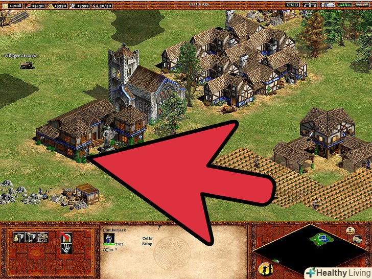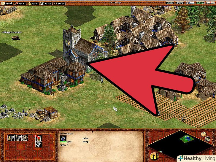 Побудуйте університет і замок.університети потрібні для вивчення корисних технологій, що відносяться до економіки та військової справи. Коли накопичите 650 одиниць каменю, отрядите чотирьох камнетесов на будівництво замку. Якщо каменю поки не вистачає, особливо якщо вас починають "рашити" (атакувати), можна побудувати монастир або військову будівлю епохи замків. Так ви виконаєте вимогу до будівель для переходу в іншу епоху.