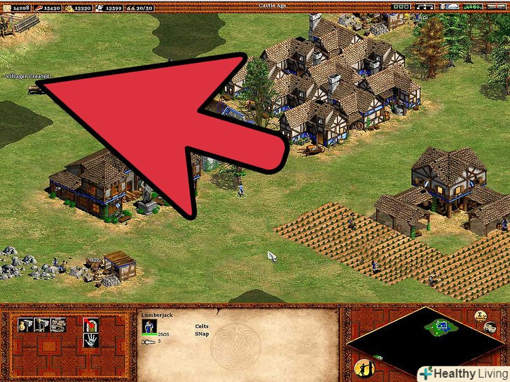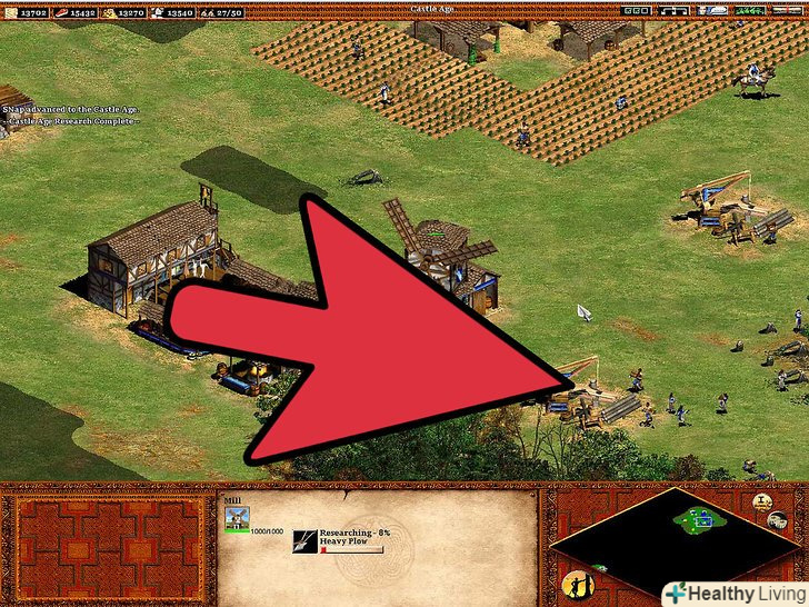 Продовжуйте розвиватися.Продовжуйте будувати ферми новими поселенцями. Повторне засіювання важливо, так як засіювання вручну стомлює і відволікає, особливо коли треба управляти військами, щоб дати відсіч ворогові. Побудовані ратуші повинні захистити вас від необхідності будувати черговий млин.- На відміну від Млинів, будувати нові лісопилки можна і потрібно, що особливо важливо в епоху замків. Рашери націляться саме на лісопилки, які знаходяться, як правило, поза радіусом дії ратуші. Відповідно, віддавши при вигляді ворога наказ ховатися, ви неприємно здивуєтеся - поселенці не побіжать в ратушу від лісопилки самі. Крім того, потрібно будувати лісопилки ще й тому, що вирубаний ліс не виростає, дистанція до лісопилки поступово збільшується, поселенці ходять все довше, а це - зайвий час, яка витрачається даремно.