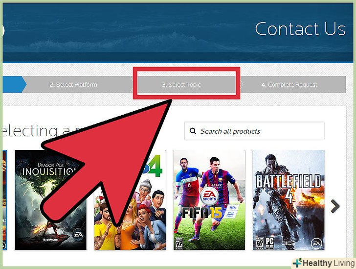Виберете гру, по якій ви хочете задати питання. деякі ігри будуть відображатися на сторінці і, натискаючи для прокрутки стрілки вліво / вправо, ви зможете знайти і вибрати потрібну вам гру.- Якщо гра, яку Ви шукаєте, не буде відображатися, введіть її назву в пошуковику сайту "Пошук всіх продуктів", в правій верхній частині сторінки. Список назв ігор буде відображатися нижче.