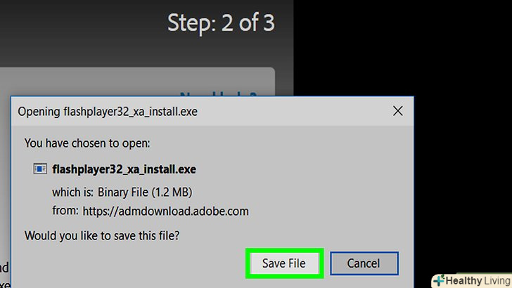 Клацніть поЗберегти файл, коли з'явиться запит. на комп'ютер викачається інсталяційний файл Adobe Flash Player.- Залежно від налаштувань Firefox цей крок можна пропустити.