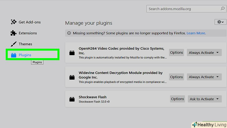 Перейдіть на вкладкуПлагіни. вона знаходиться в лівій частині сторінки.