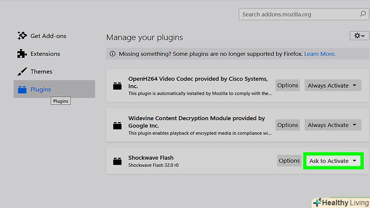 Увімкніть автоматичне відтворення Flash-контенту. натисніть на «включати за запитом» праворуч від «Shockwave Flash«, а потім в меню виберіть»завжди включати".- Пропустіть цей крок, якщо хочете, щоб Firefox запитував дозвіл на відтворення Flash-контенту.