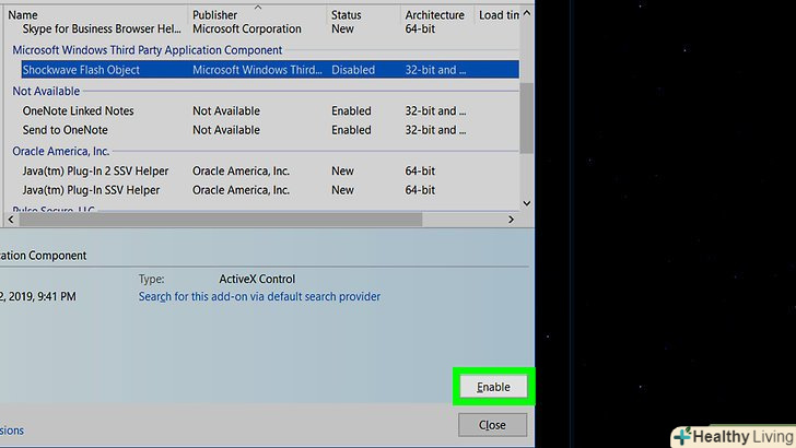 НатиснітьВключити. ви знайдете цю кнопку в нижній правій частині вікна. Flash Player буде включений.- Якщо ви бачите кнопку "Відключити", Flash Player вже включений в Internet Explorer.
