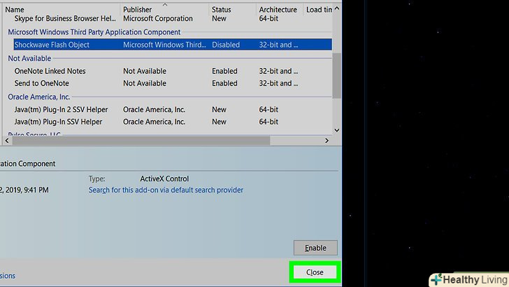 Клацніть поЗакрити.ця опція знаходиться в нижньому правому куті вікна. Зміни будуть збережені, а вікно закриється; тепер Internet Explorer буде відтворювати Flash-контент.- Internet Explorer відтворює Flash-контент автоматично, тобто ваш дозвіл не потрібно.