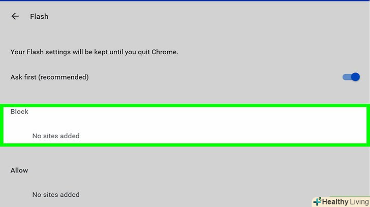 Розблокуйте сайт (якщо необхідно). щоб увімкнути Flash для заблокованого сайту, виконайте наступні дії:- У списку «блокувати» знайдіть потрібний сайт;