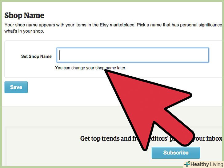 Виберіть назву для вашого магазину. яке б назву ви не підібрали для свого Etsy магазину, воно залишиться у вас до тих пір, поки діє обліковий запис Etsy, і буде служити в якості імені користувача на сайті. Вам буде потрібно отримати новий обліковий запис, якщо зважитеся поміняти назву магазину. Воно повинно бути виділяється, але не надто важким для введення в пошуковому полі, що знаходиться зверху сторінки Etsy.- Гарненько простудіюйте список можливих назв, після пошукайте вподобані Вам варіанти в Etsy, щоб перевірити наявність чогось подібного на сайті. Не обов'язково занадто виділятися, але слід вибрати назву, яка не буде асоціюватися з іншим магазином. (Ви могли б також про всяк випадок перевірити, чи існує така назва як частина URL-посилання сайту на випадок, якщо бажаєте створити окремий веб-ресурс.)
