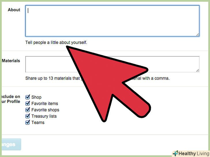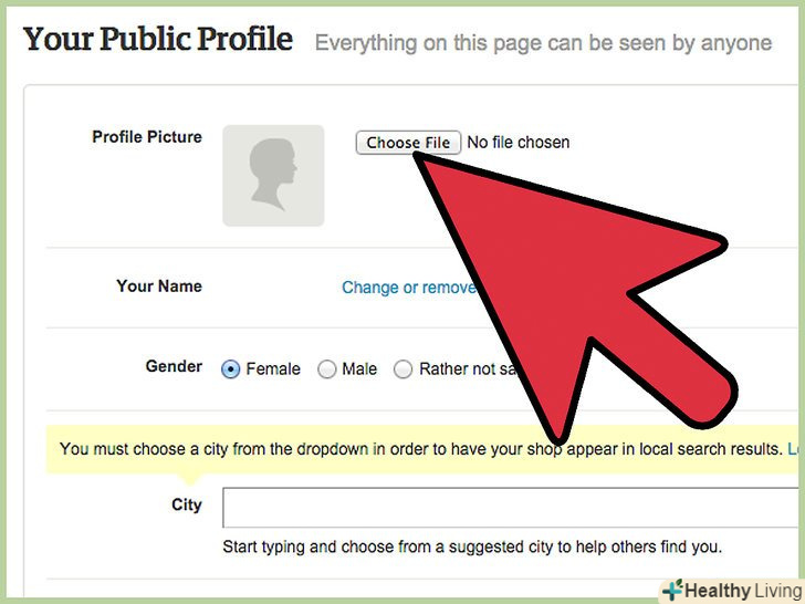 Заповніть свій профіль. добре прописаний профіль говорить потенційним покупцям, хто ви є, чому вони повинні купувати товари у вас, і як ваш магазин працює. У профілі слід підготувати вступний параграф, захоплюючий увагу читача, з викладом логічної, чіткої, стислої і доступної інформації в наступних пунктах. Вкажіть достатню кількість персональної інформації, даючи покупцям можливість зв'язатися з вами, але не занадто багато, щоб це не виглядало менш професійно.- При наявності у вас декількох імен користувачів на Etsy, сайт вимагає перерахувати їх все в особистому профілі. Аналогічним чином, якщо у вашому магазині працюють разом кілька людей, тоді кожен користувач повинен бути вказаний в профілі з уточненням його або її функцій в колективі.