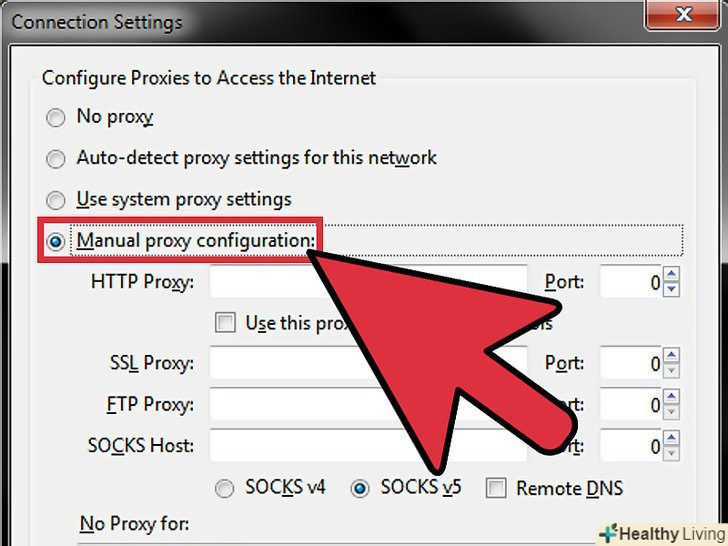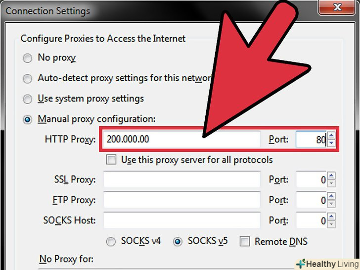Введіть адресу IP / HTTP і номер порту проксі-сервера, до якого ви хочете підключитися.введіть у відповідні поля адресу та номер порту.- Зв'яжіться з IT-відділом своєї фірми, якщо ви не знаєте IP-адресу і номер порту проксі-сервера, до якого хочете підключитися.