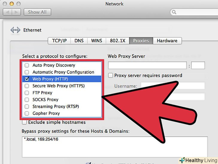 Виберіть проксі-сервер. у списку "виберіть протокол для налаштування" необхідно вибрати тип проксі-сервера, який ви хочете використовувати.- Попросіть допомоги у IT-відділу, якщо ви не знаєте, до якого протоколу проксі-сервера необхідно підключитися. Якщо ви використовуєте стандартний проксі-сервер для підключення до Інтернету, виберіть зі списку " Веб-проксі (HTTP)».